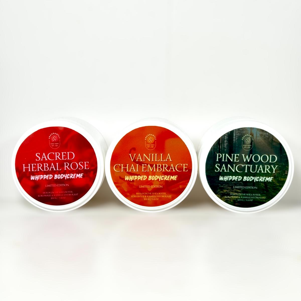 Vrij te combineren — Sacred Herbal Rose, Vanilla Chai Embrace en Pine Wood Sanctuary.